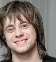 Two purple business cards featuring sleek typography and a single rounded corner are placed on a surface with soft shadows. The foreground card prominently displays the brand name in bold letters, while the background card includes contact details and a QR code in white text.